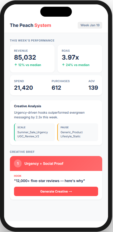 The Peach System analyses your Meta Ads performance every week, compares it to your own history, and tells you exactly what’s working. You get insights, creative briefs, and a generator that turns those briefs into ads.