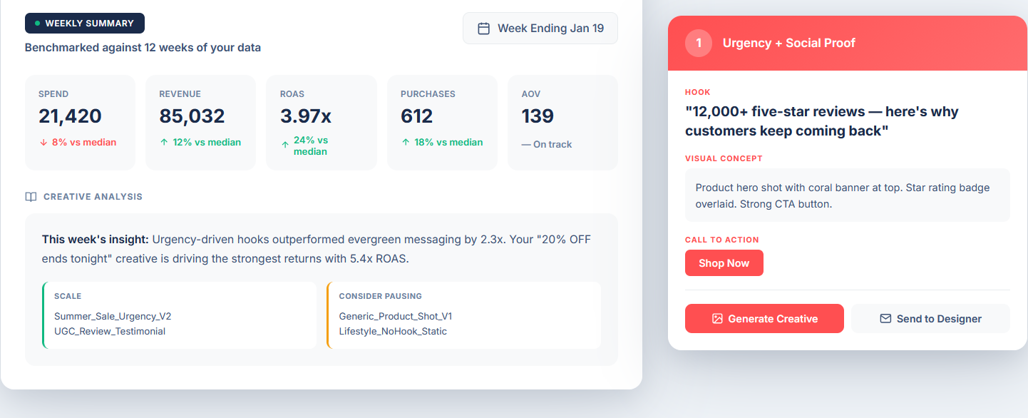 Every week, you get a clear breakdown of how your Meta Ads are performing – not compared to random industry benchmarks, but against your own history. So you actually know if a bad week is a problem or just normal.